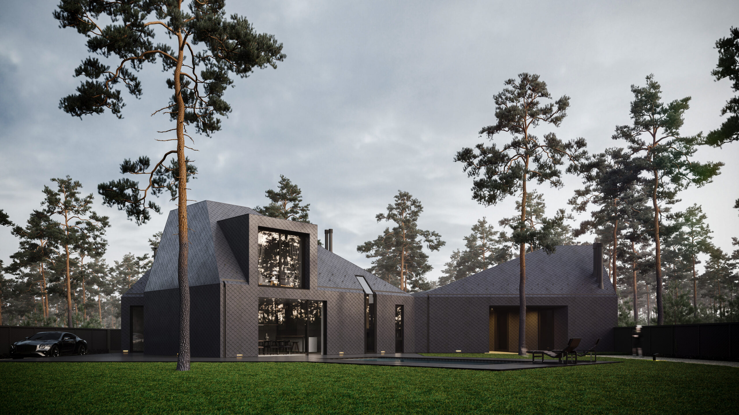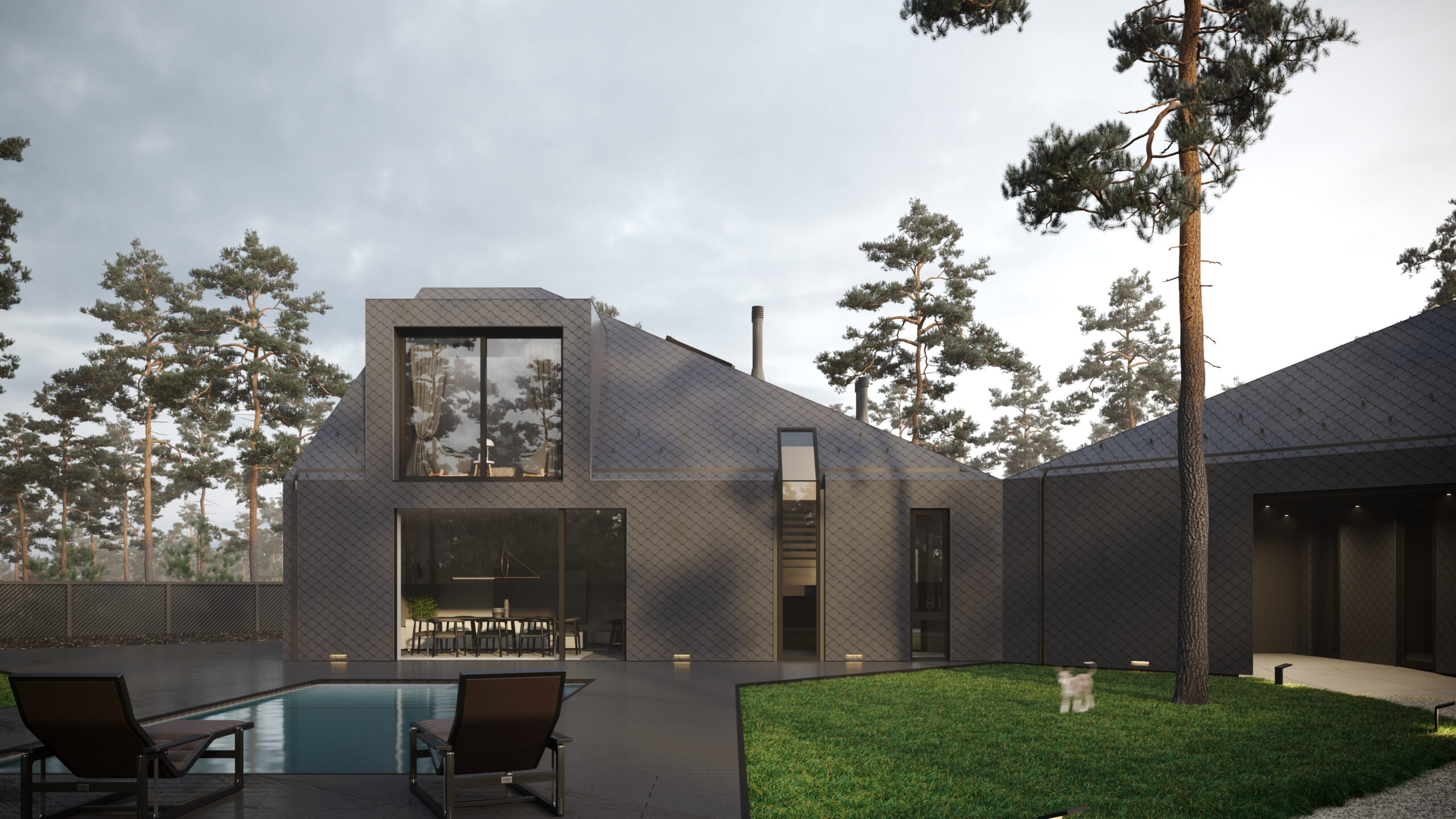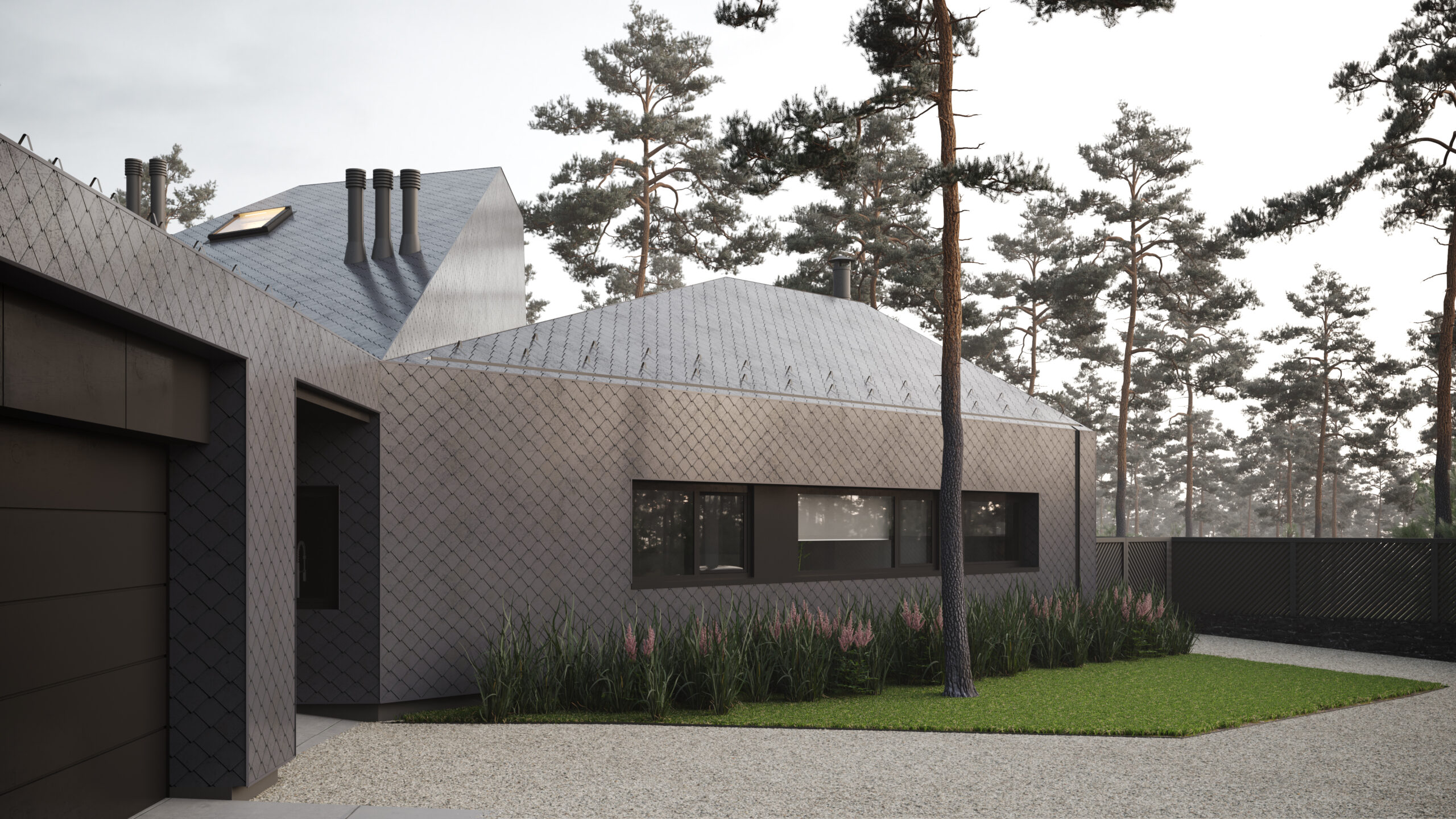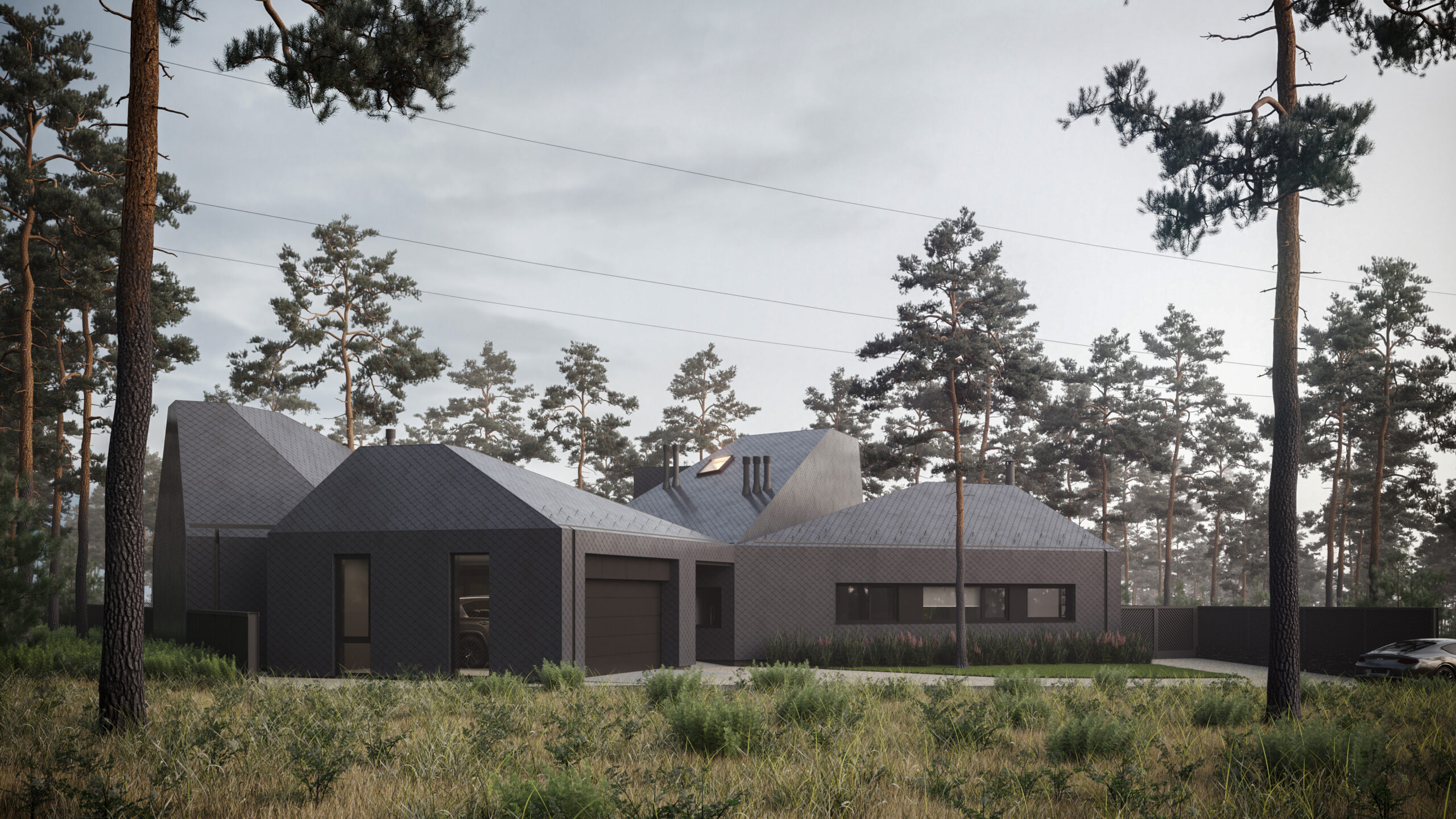 Цей сімейний будинок має дві прості, архетипні форми, що перетинають одна одну, утворюючи надзвичайно цікаве планувальне рішення. Таким чином зона відпочинку відокремлена від технічної зони. Об’єм будівлі складний та динамічний, при цьому гармонічно контрастуючий з простими, чіткими формами плану. Завдяки єдиному матеріалу фасадів та покрівель, ми створили мінімалістичну будівлю, що чудово гармонує з природним середовищем, в якому знаходиться.