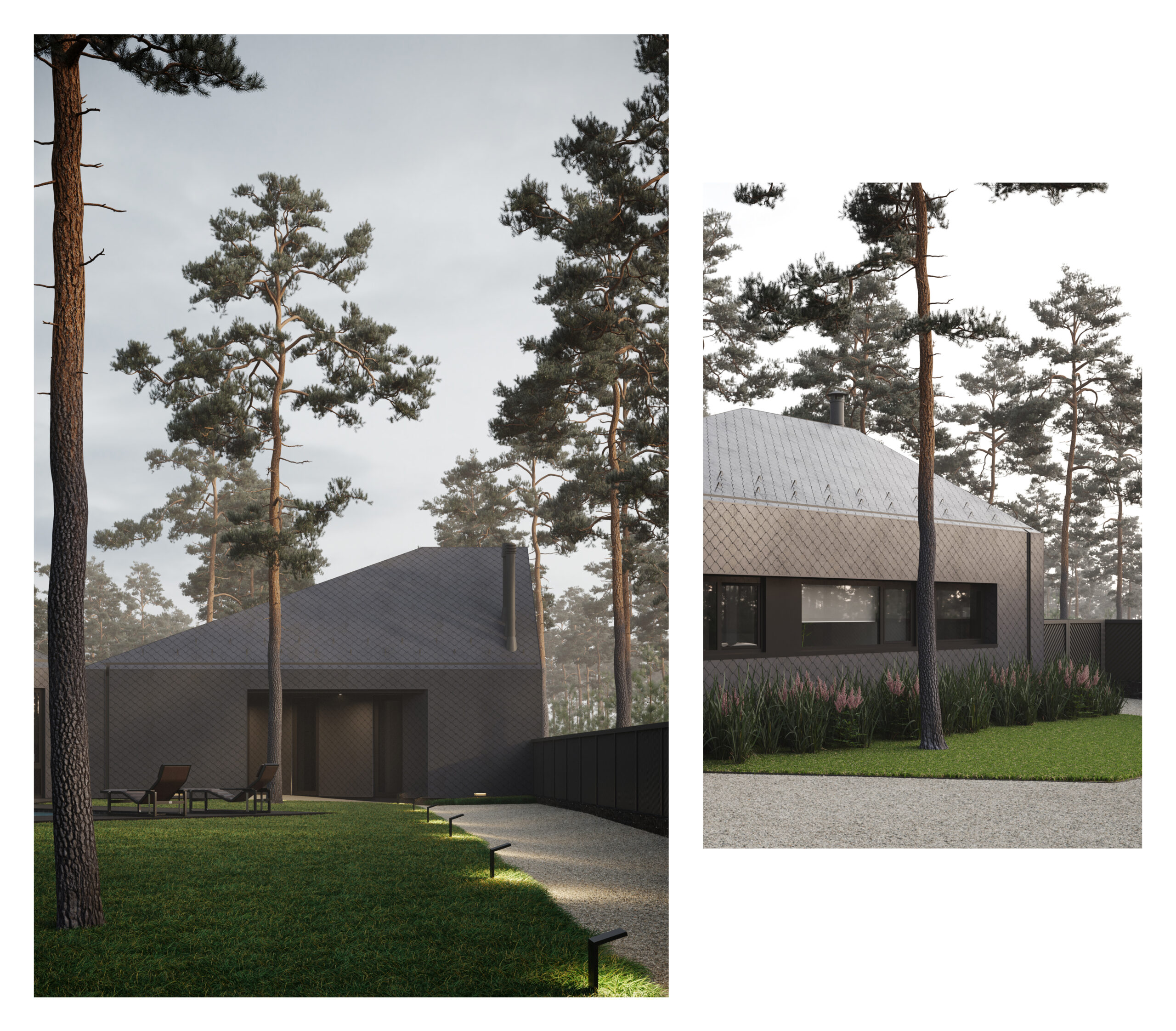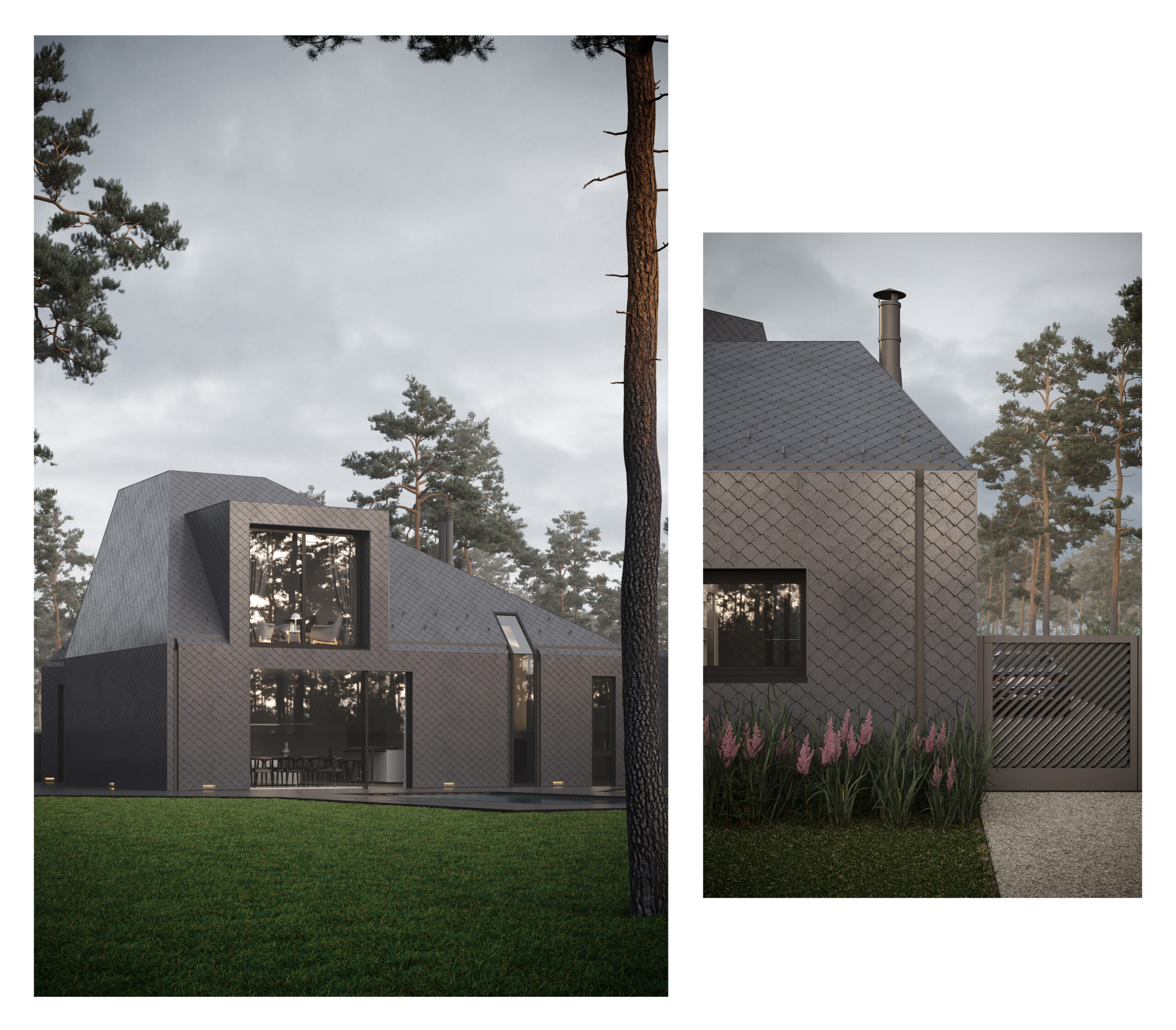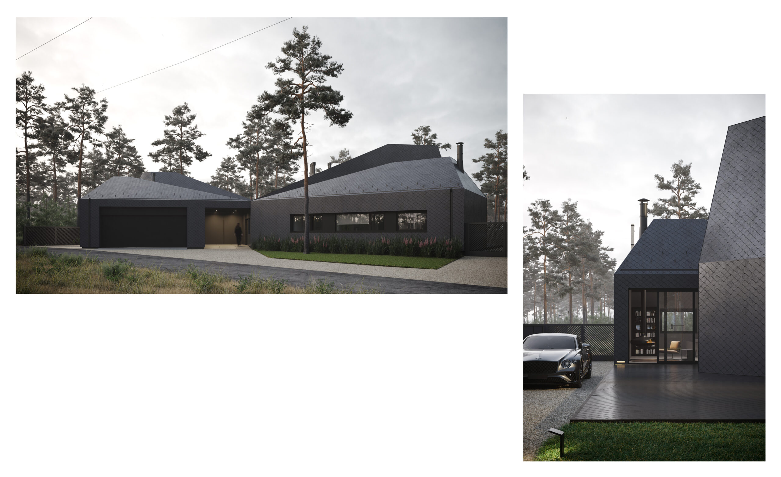 Цей сімейний будинок має дві прості, архетипні форми, що перетинають одна одну, утворюючи надзвичайно цікаве планувальне рішення. Таким чином зона відпочинку відокремлена від технічної зони. Об’єм будівлі складний та динамічний, при цьому гармонічно контрастуючий з простими, чіткими формами плану. Завдяки єдиному матеріалу фасадів та покрівель, ми створили мінімалістичну будівлю, що чудово гармонує з природним середовищем, в якому знаходиться.