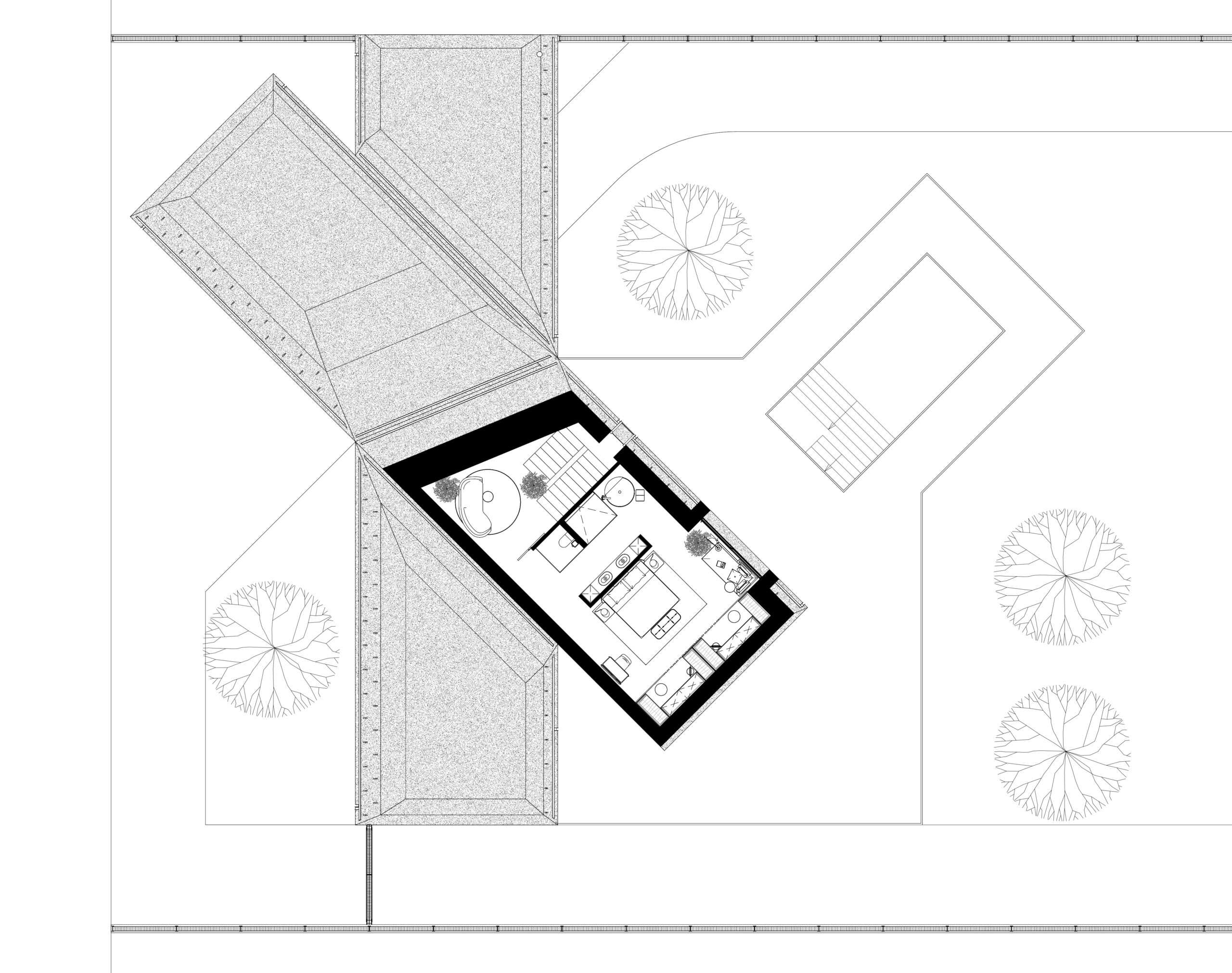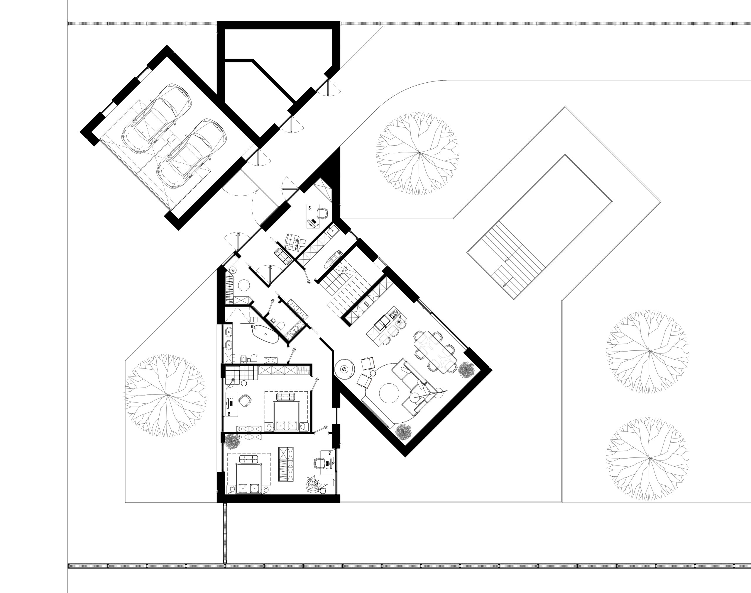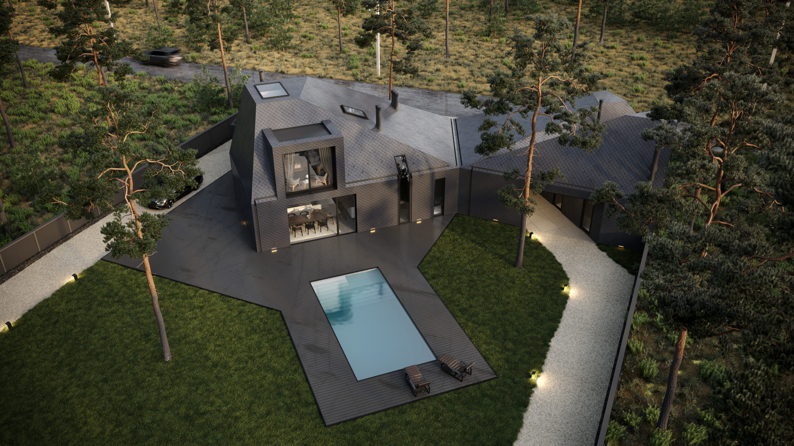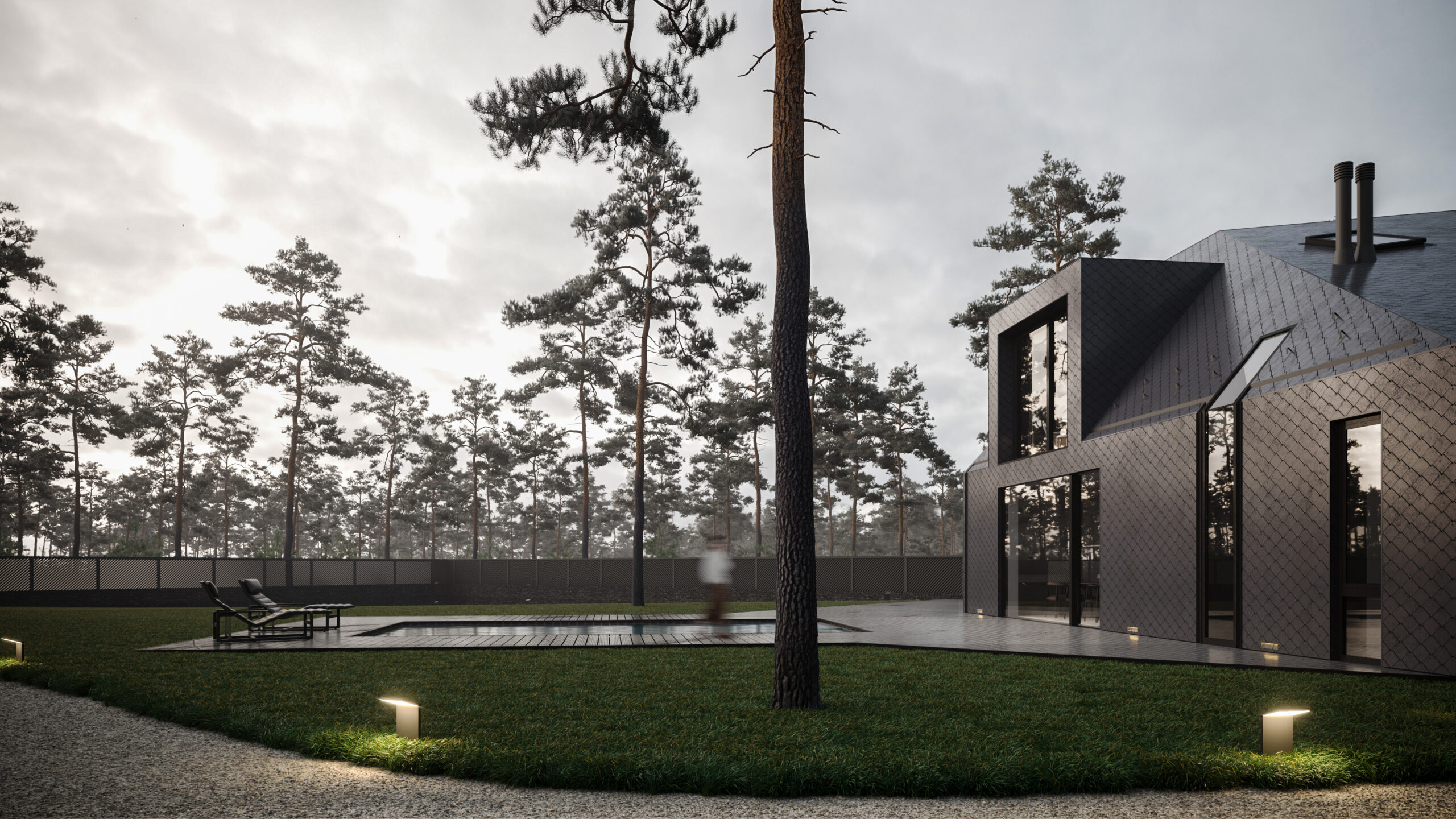 Цей сімейний будинок має дві прості, архетипні форми, що перетинають одна одну, утворюючи надзвичайно цікаве планувальне рішення. Таким чином зона відпочинку відокремлена від технічної зони. Об’єм будівлі складний та динамічний, при цьому гармонічно контрастуючий з простими, чіткими формами плану. Завдяки єдиному матеріалу фасадів та покрівель, ми створили мінімалістичну будівлю, що чудово гармонує з природним середовищем, в якому знаходиться.