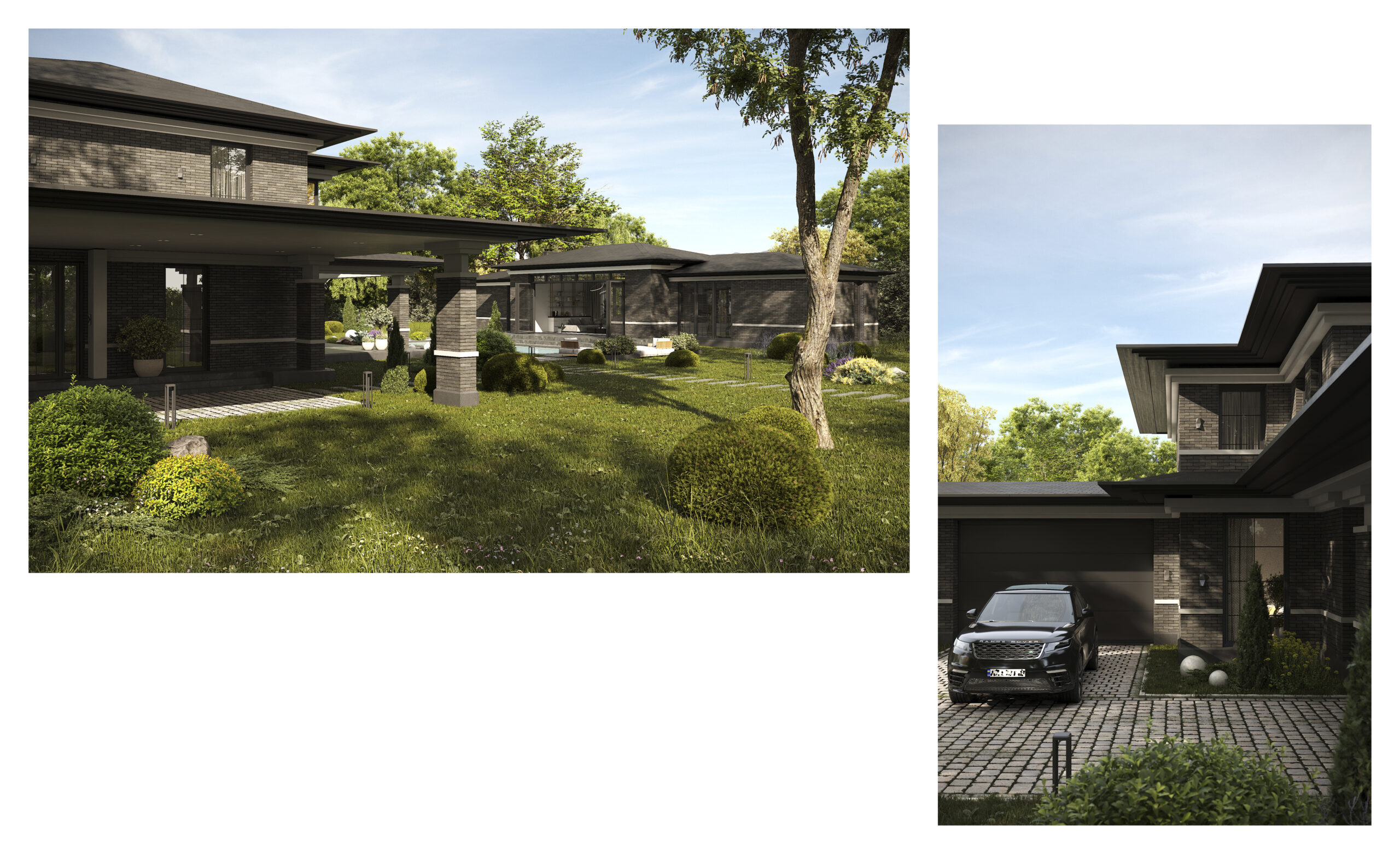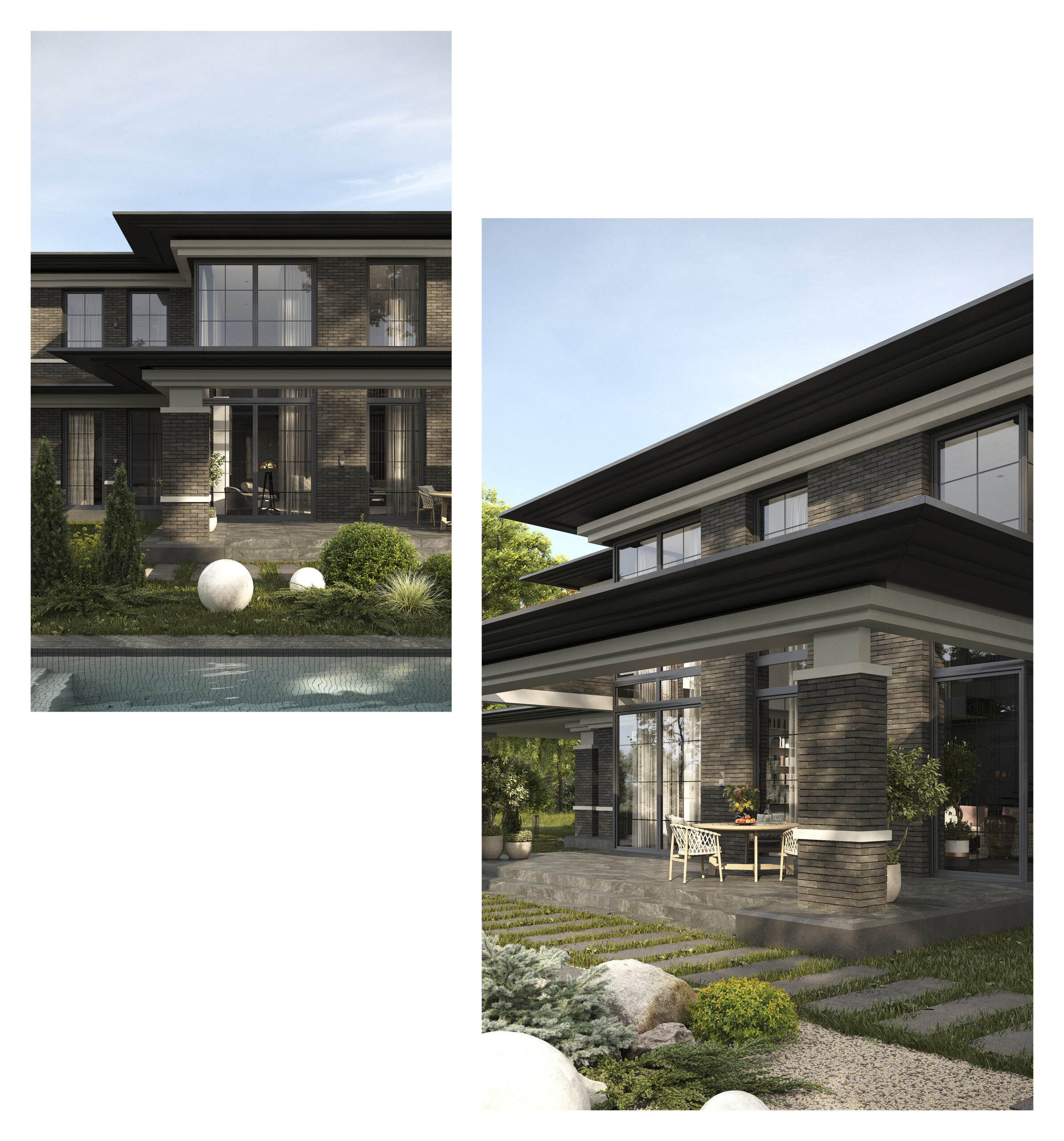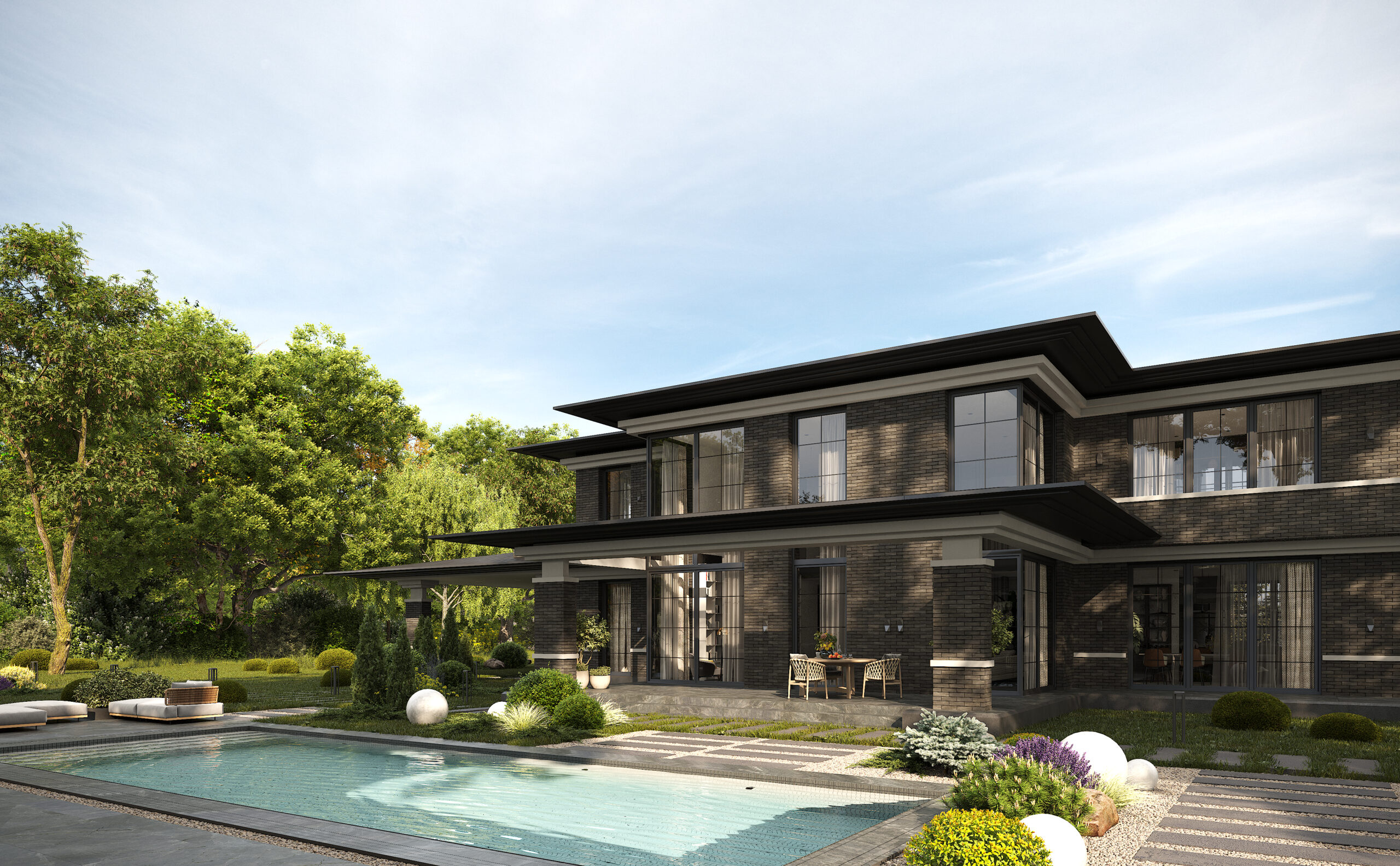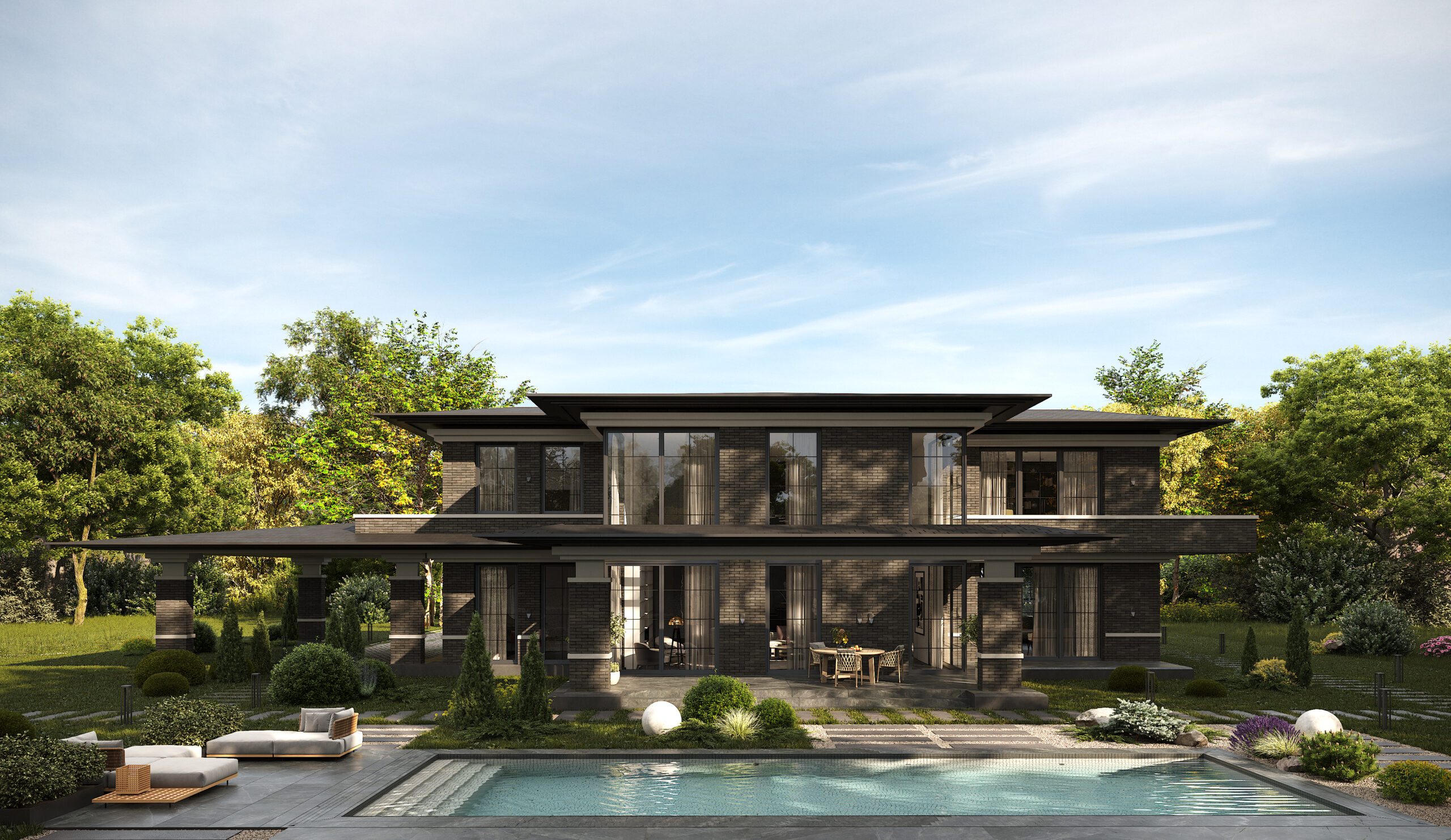 Приватний будинок в спокійному районі Києва, розрахований на велику сім’ю. Будинок спроектовано як чудове місце під віддалену роботу, при тому він має комфортні умови для відпочинку як усередині так і надворі. Великі вікна та відкритий простір наповнюють будинок світлом та надають можливість милуватись краєвидом. Будинок має розкішний басейн та лаунж зону. Сучасний дизайн, якісні матеріали та незаймана природа створюють атмосферу релаксу та комфорту. В той час як прямі лінії, нейтральні кольори та мінімалістичний підхід роблять будинок затишним та стильним.