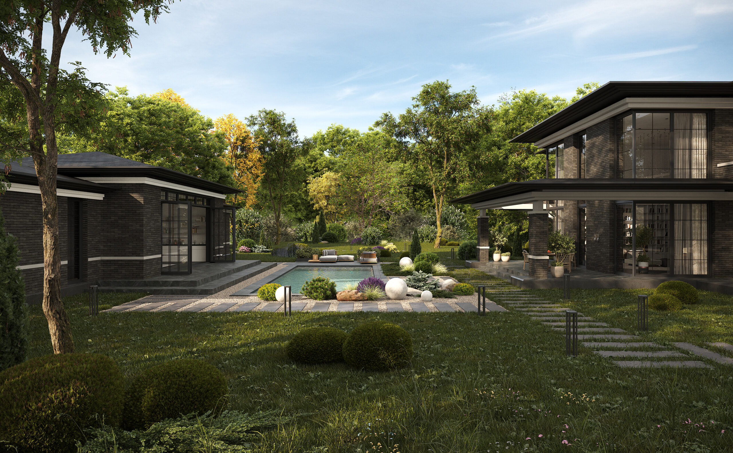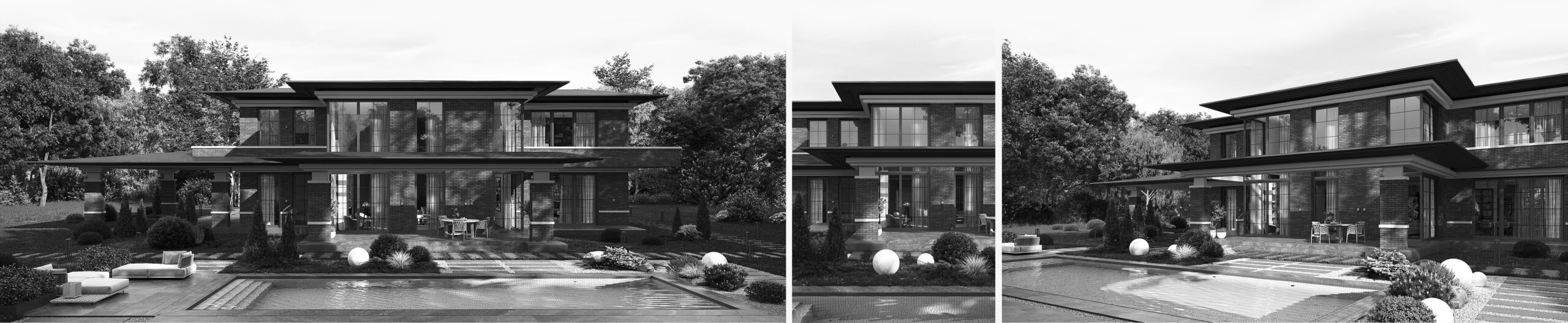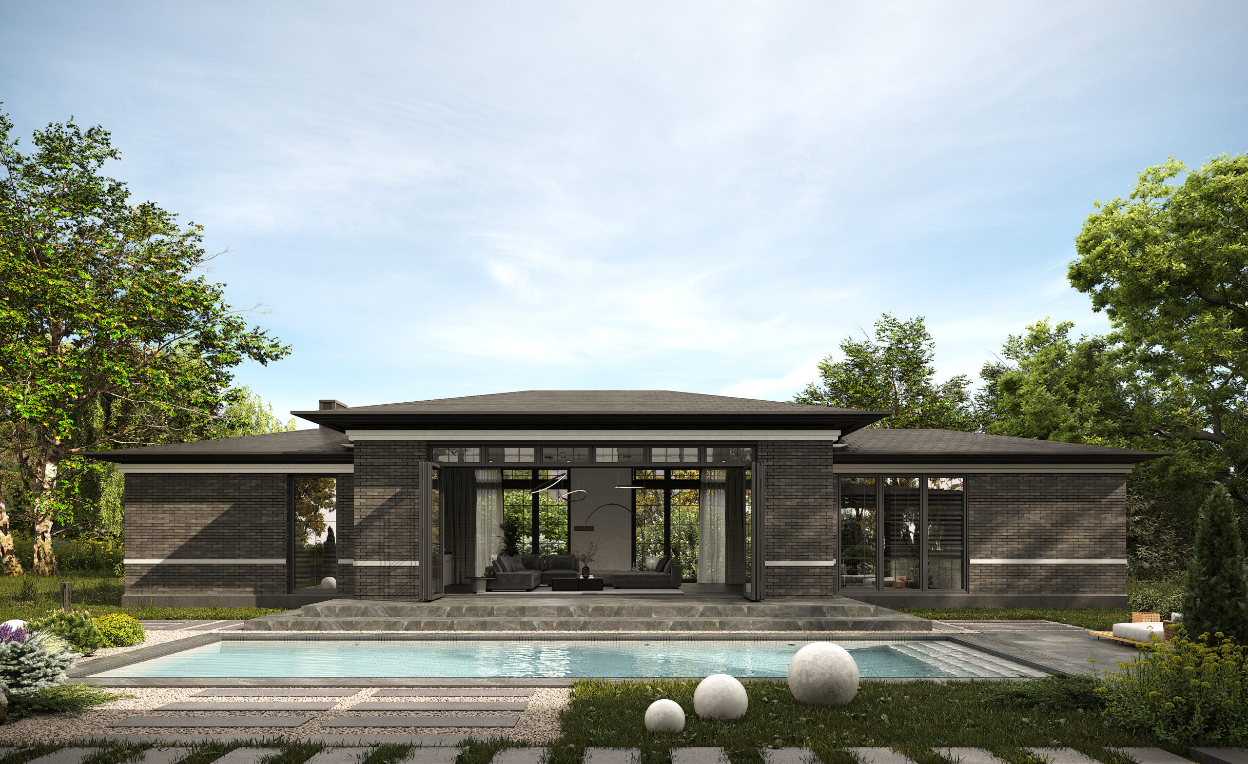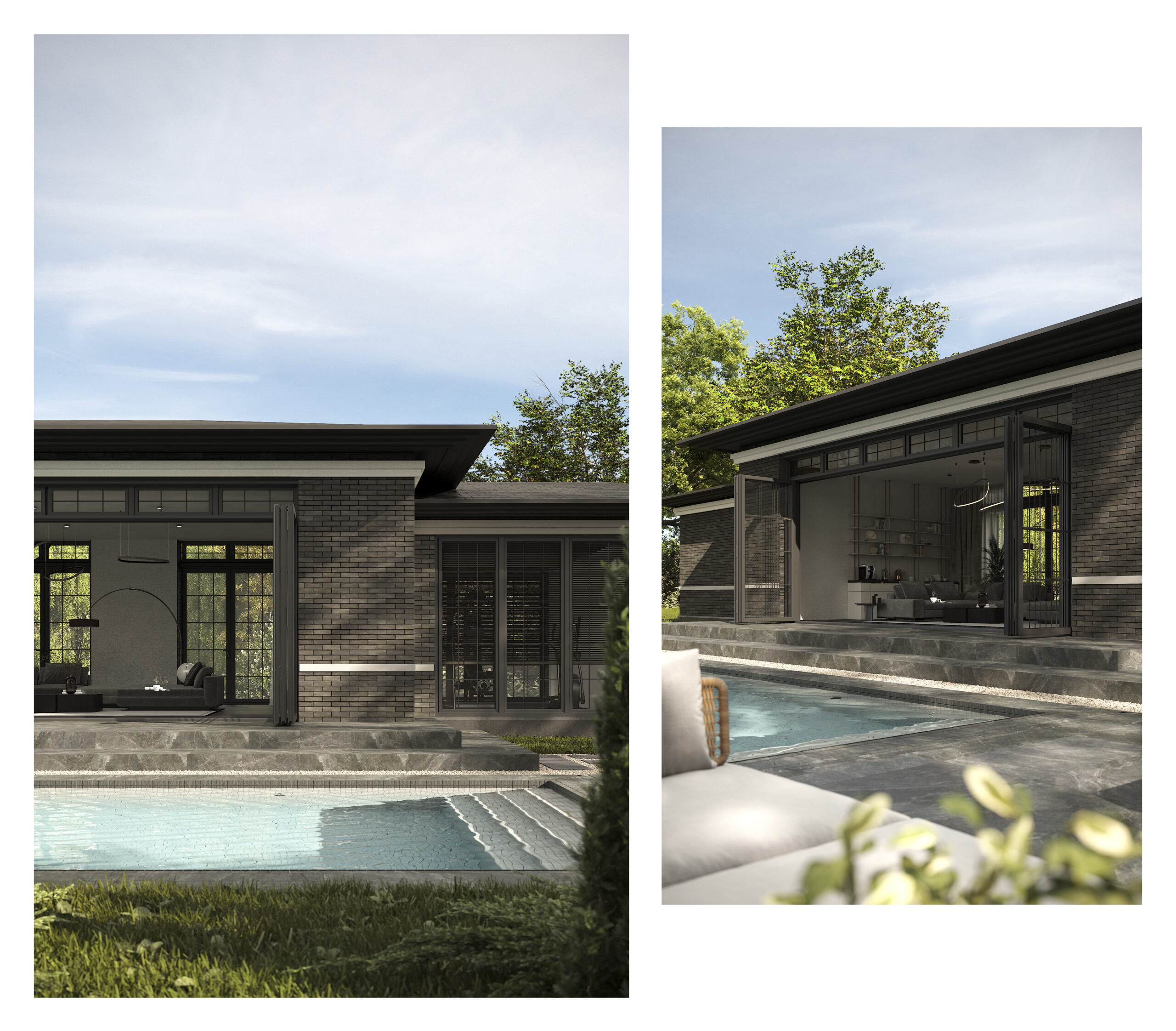 Приватний будинок в спокійному районі Києва, розрахований на велику сім’ю. Будинок спроектовано як чудове місце під віддалену роботу, при тому він має комфортні умови для відпочинку як усередині так і надворі. Великі вікна та відкритий простір наповнюють будинок світлом та надають можливість милуватись краєвидом. Будинок має розкішний басейн та лаунж зону. Сучасний дизайн, якісні матеріали та незаймана природа створюють атмосферу релаксу та комфорту. В той час як прямі лінії, нейтральні кольори та мінімалістичний підхід роблять будинок затишним та стильним.