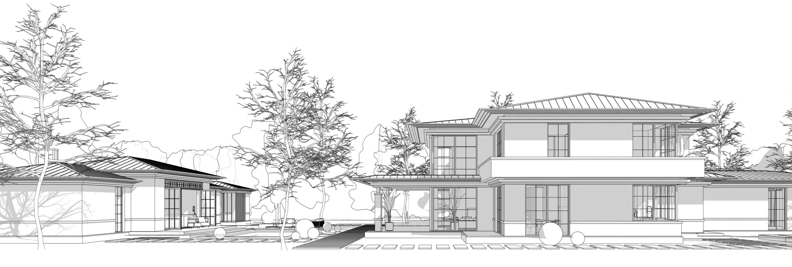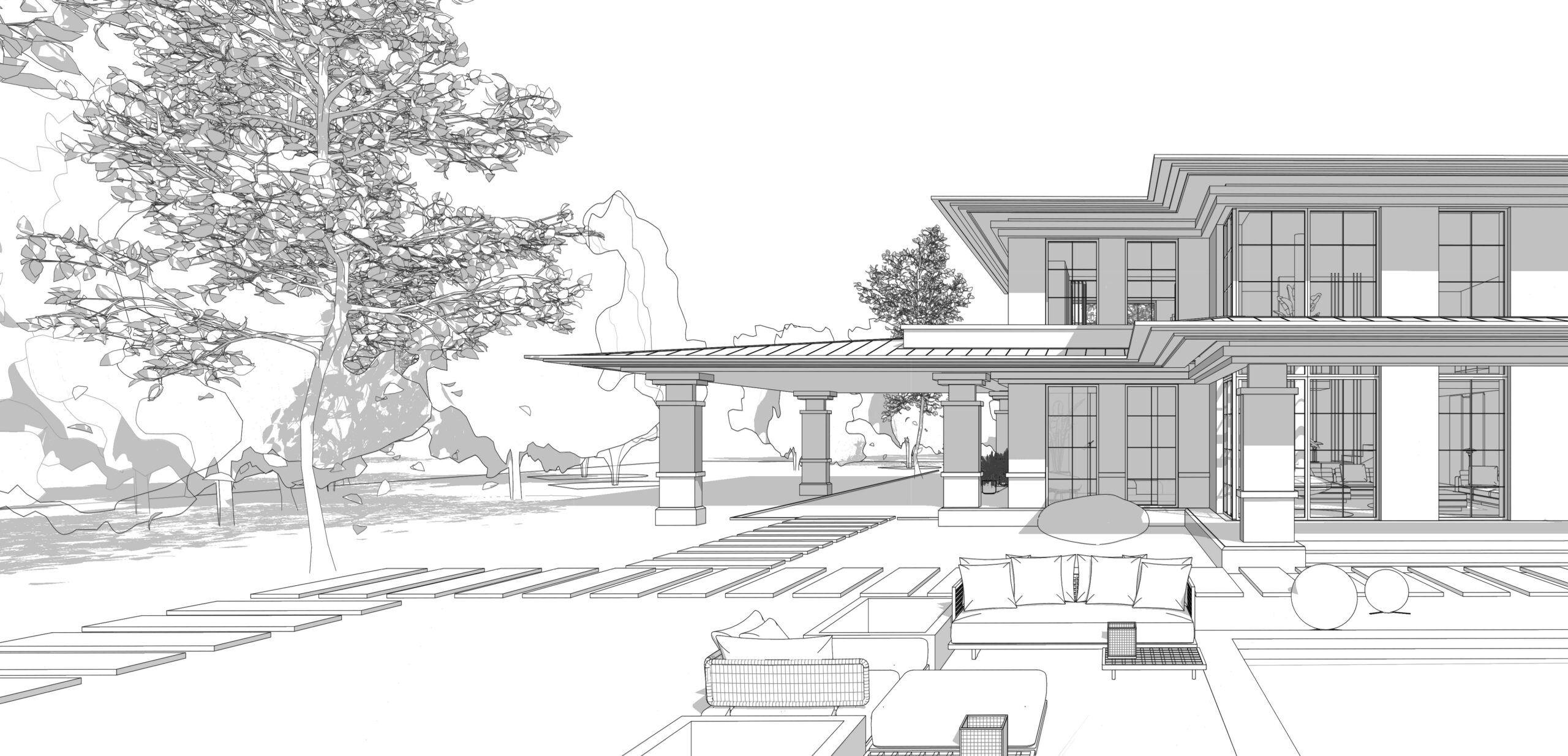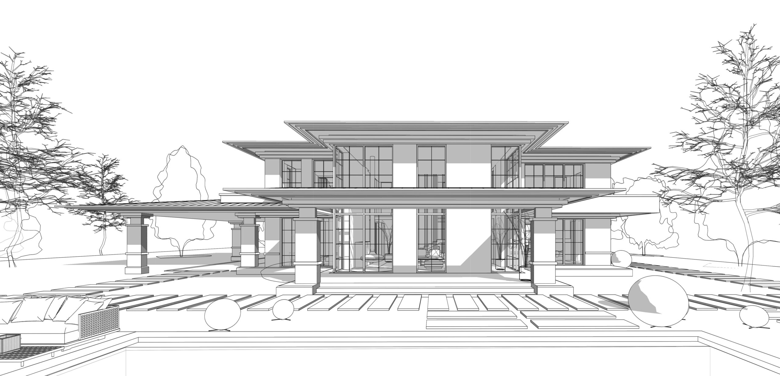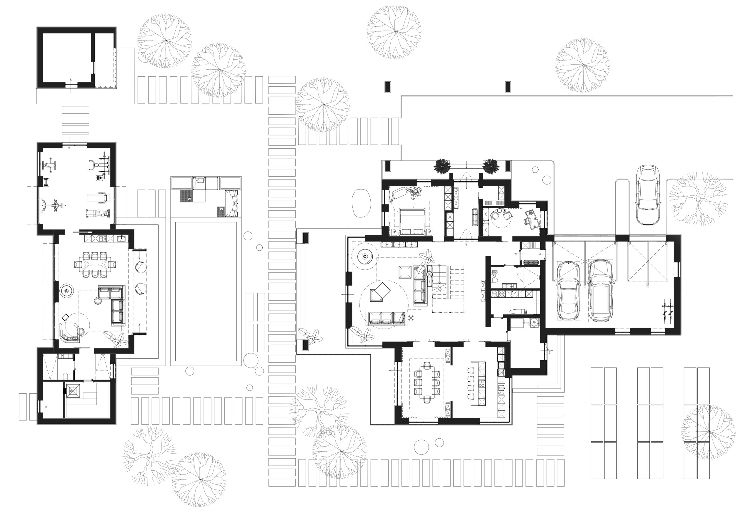 Приватний будинок в спокійному районі Києва, розрахований на велику сім’ю. Будинок спроектовано як чудове місце під віддалену роботу, при тому він має комфортні умови для відпочинку як усередині так і надворі. Великі вікна та відкритий простір наповнюють будинок світлом та надають можливість милуватись краєвидом. Будинок має розкішний басейн та лаунж зону. Сучасний дизайн, якісні матеріали та незаймана природа створюють атмосферу релаксу та комфорту. В той час як прямі лінії, нейтральні кольори та мінімалістичний підхід роблять будинок затишним та стильним.