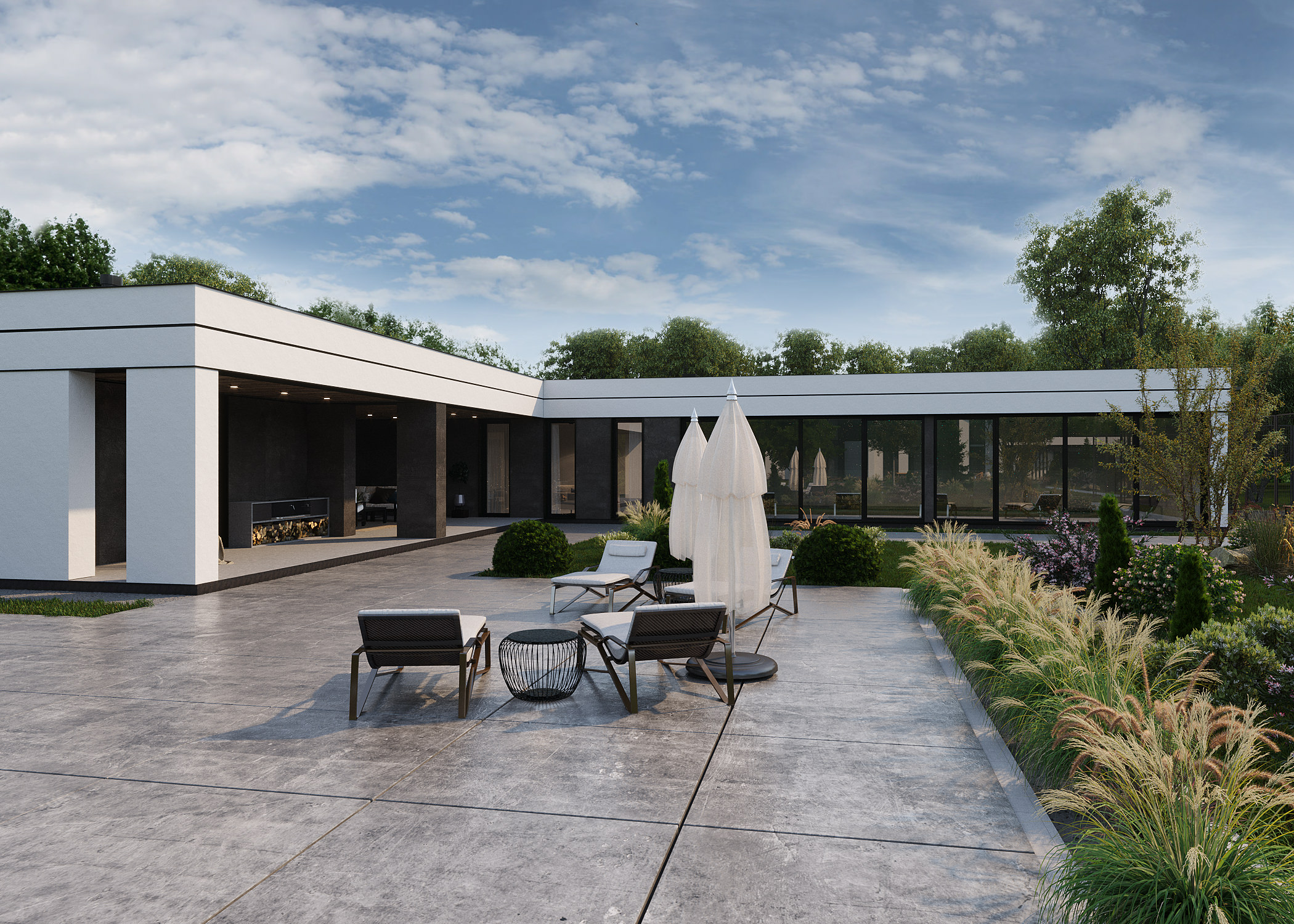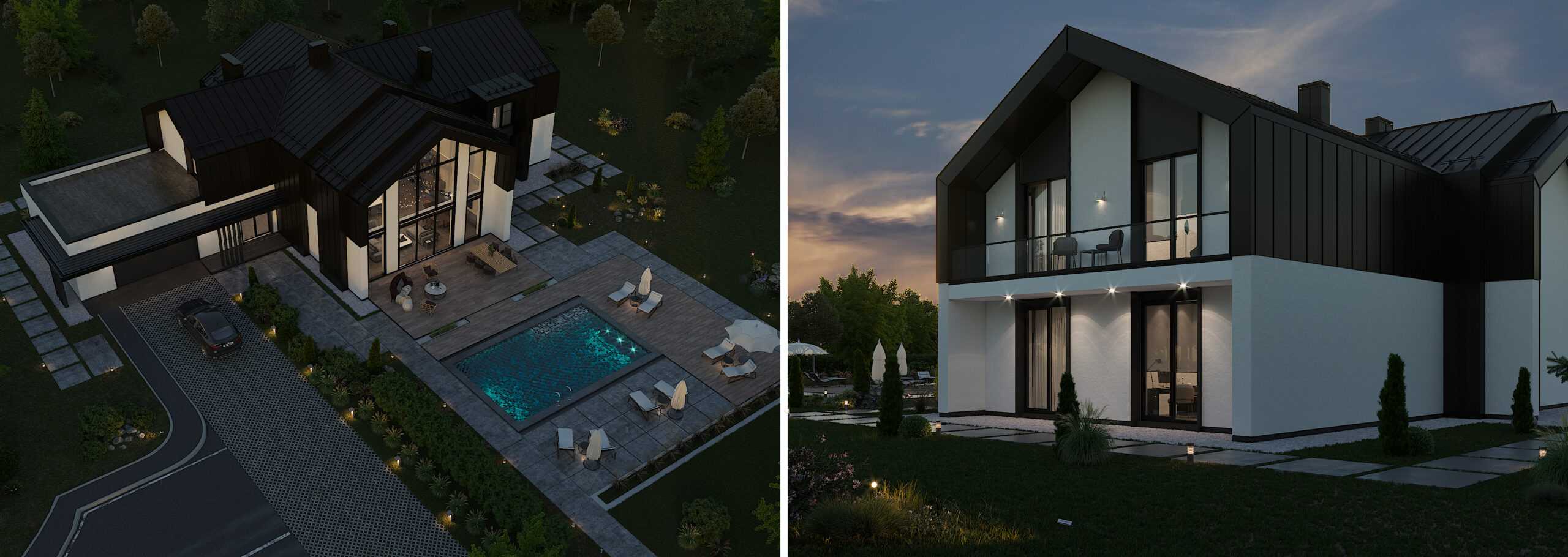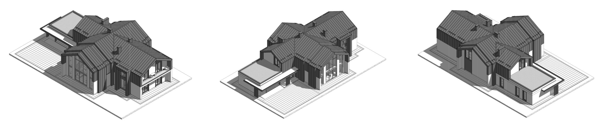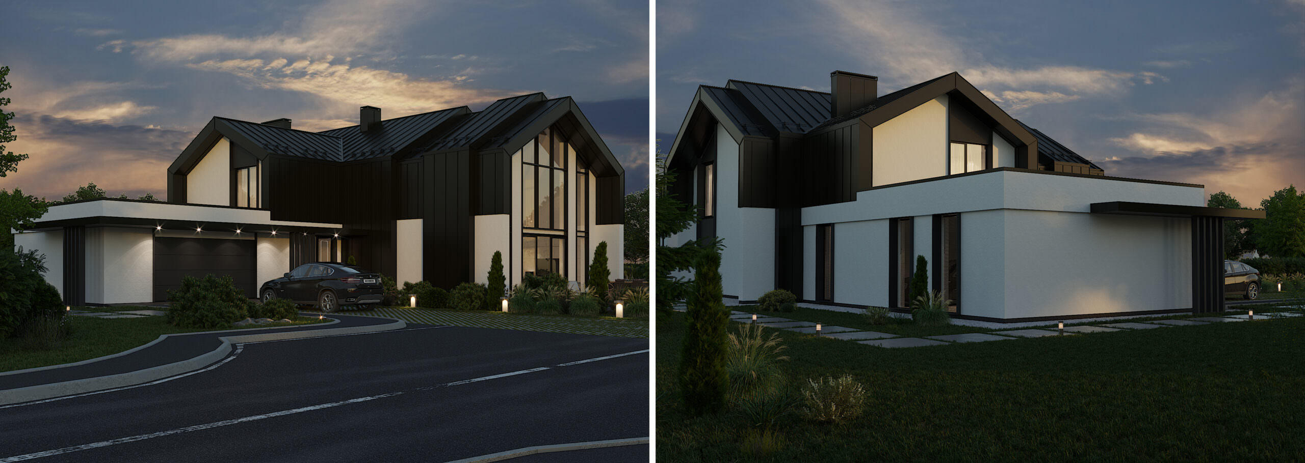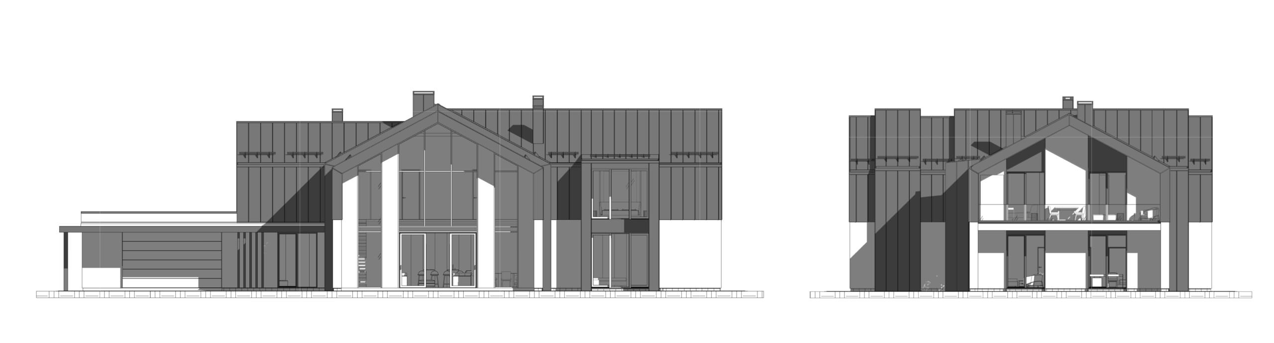Темою проекту W House є поєднання складної форми і мінімалістичного оздоблення. Цей будинок монолітний і громіздкий, тому, щоб збалансувати композицію, його силует урізноманітнили фронтони. Вони ділять суцільний об’єм на менші частки, наближуючи будинок до людського масштабу. У оздобленні фасадів використано лише два матеріали: біла штукатурка і чорний фальцевий метал. Монохромне оздоблення найкраще виявляє складну форму будинку – чорні деталі на білому фоні, як, наприклад, віконні рами, створюють графічну картинку, у якій нічого не відволікає від ламаних ліній, пропорцій, світла і тіні.