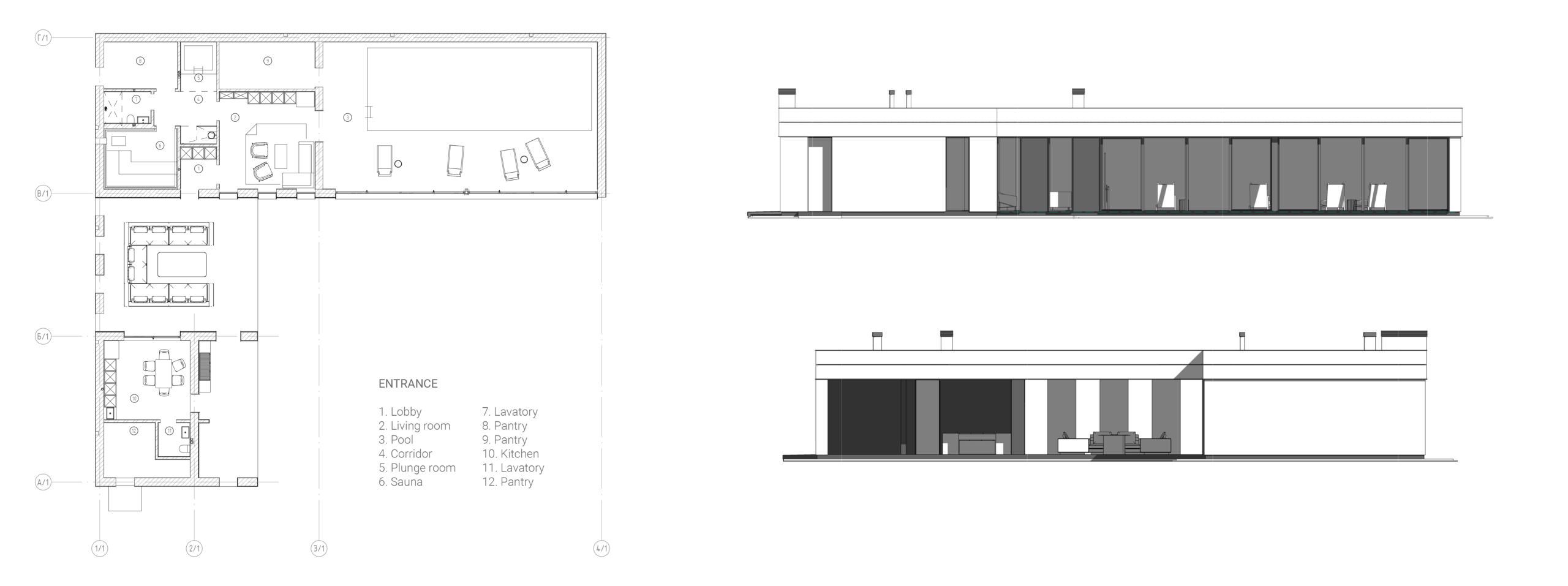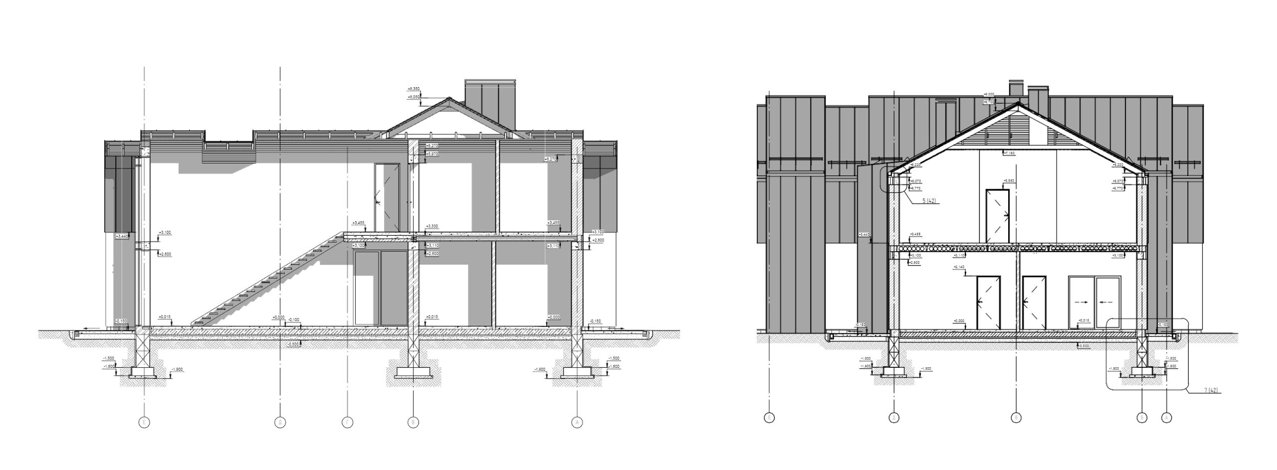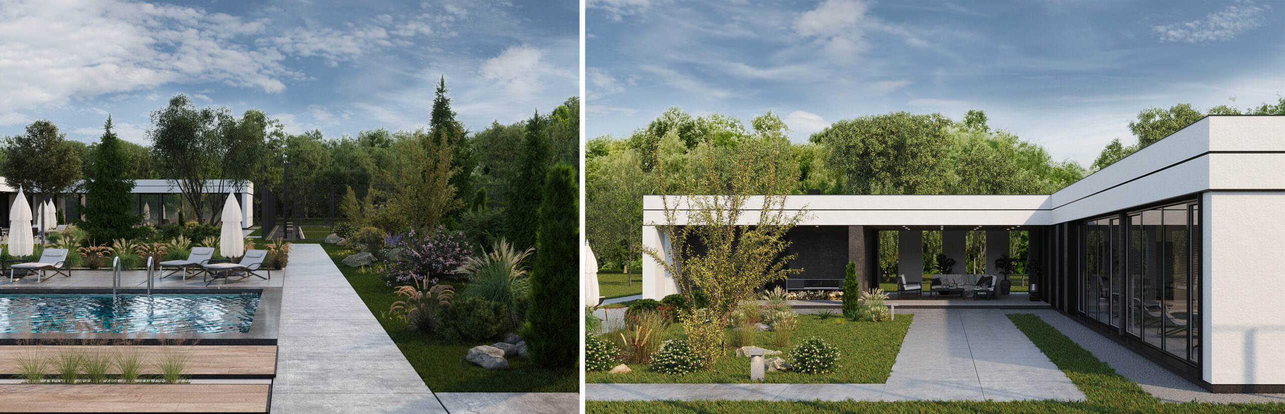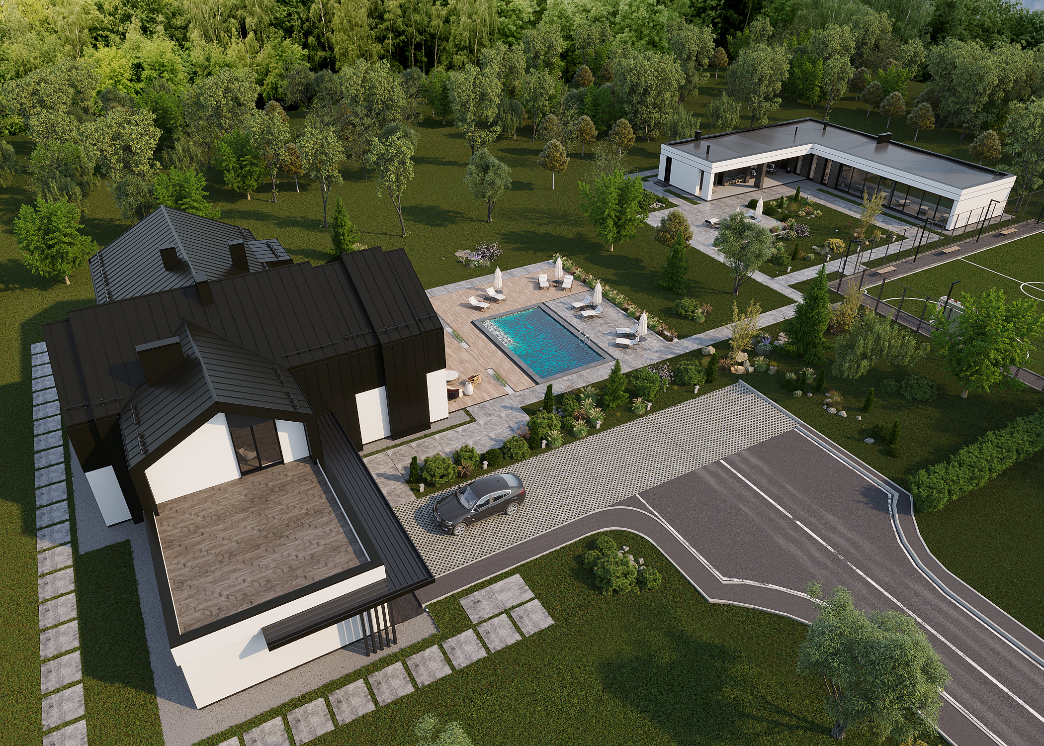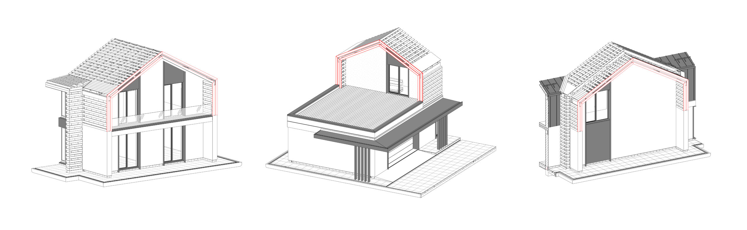 Темою проекту W House є поєднання складної форми і мінімалістичного оздоблення. Цей будинок монолітний і громіздкий, тому, щоб збалансувати композицію, його силует урізноманітнили фронтони. Вони ділять суцільний об’єм на менші частки, наближуючи будинок до людського масштабу. У оздобленні фасадів використано лише два матеріали: біла штукатурка і чорний фальцевий метал. Монохромне оздоблення найкраще виявляє складну форму будинку – чорні деталі на білому фоні, як, наприклад, віконні рами, створюють графічну картинку, у якій нічого не відволікає від ламаних ліній, пропорцій, світла і тіні.